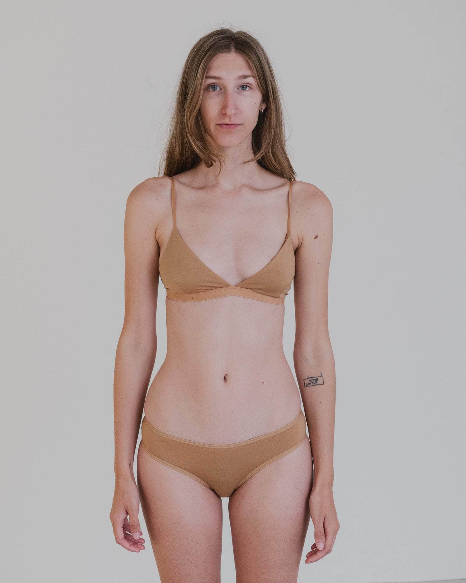 Bamboo lyocell bra. Darts at chest. Thin elastic trim at hem. Thin adjustable straps. Self lined. Supportive for medium and small bust. Undyed. Model wears a size M. 93% Bamboo Lyocell 7% Elastane. Made in Portugal. Fiber origin – China. Spun in Portugal/Brazil. Knitted in Portugal. Sewn in Portugal