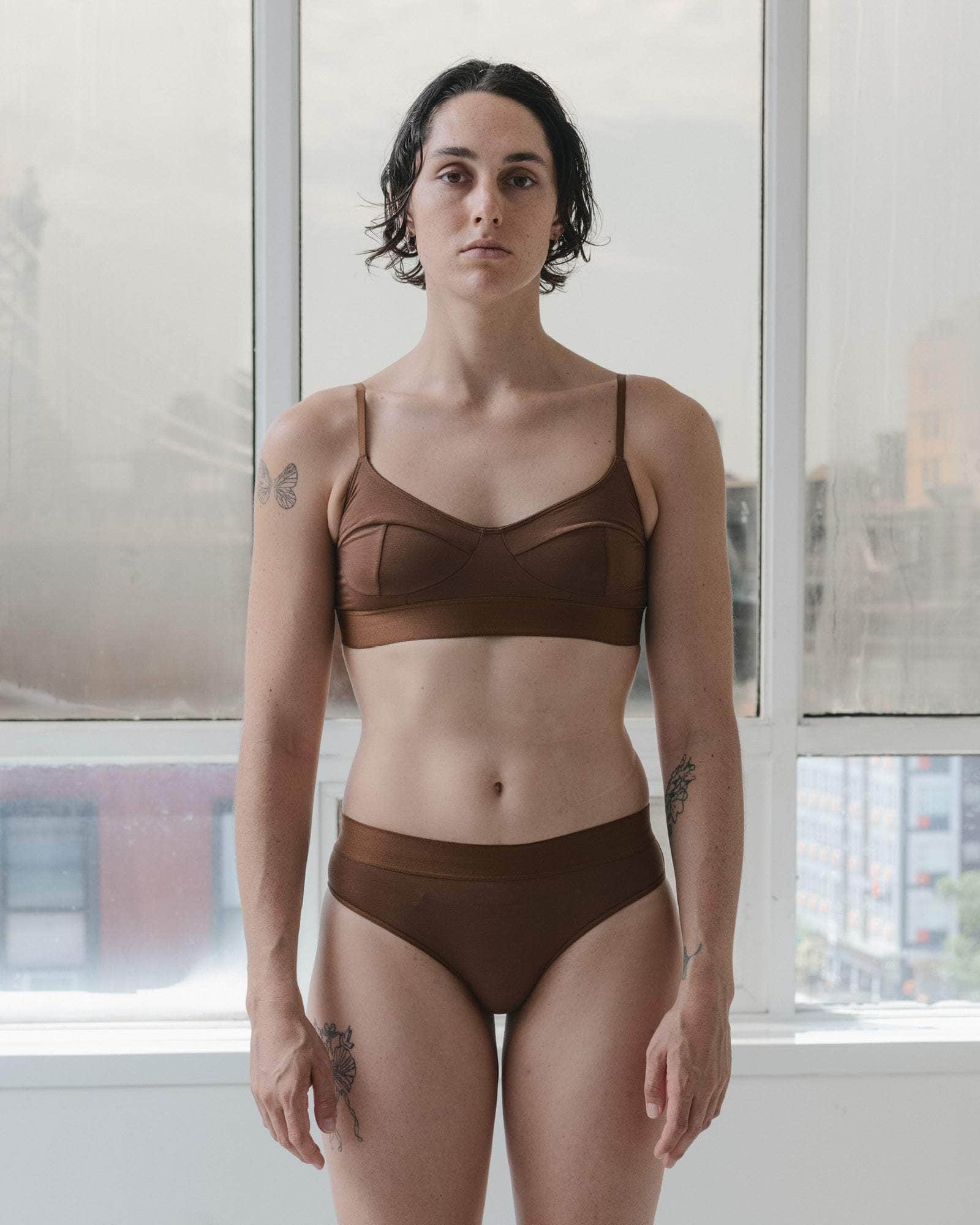 Bamboo lyocell bra. Elastic trim at neckline and hem. Supportive seamed cups. Thin adjustable straps. Supportive for large, medium, and small bust. Undyed. Model wears a size M and is 167cm. 93% Bamboo Lyocell 7% Elastane. Made in Portugal. Fiber origin – China. Spun in Portugal/Brazil. Knitted in Portugal. Sewn in Portugal