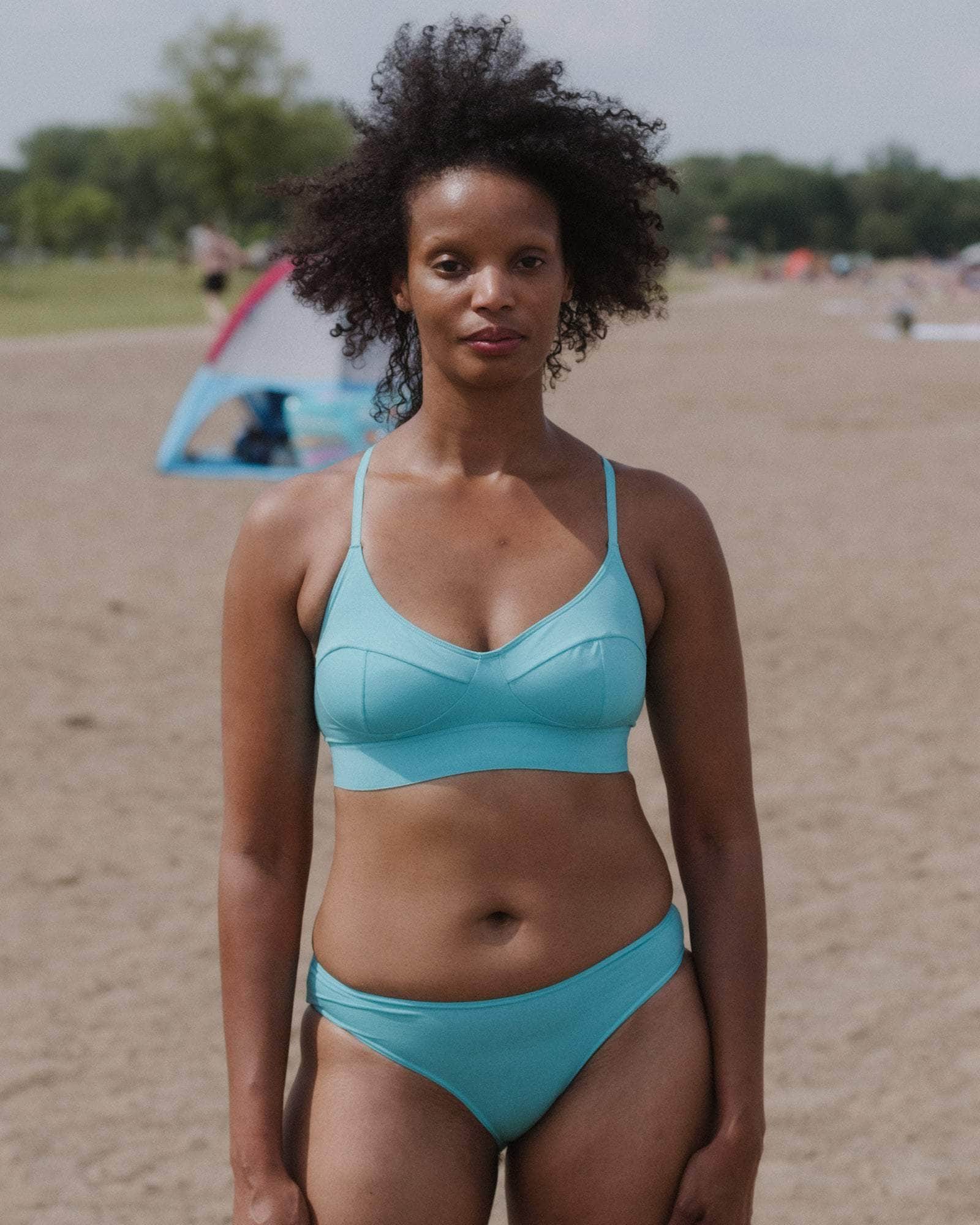 Bamboo lyocell bra. Elastic trim at neckline and hem. Supportive seamed cups. Thin adjustable straps. Supportive for large, medium, and small bust. 93% Bamboo Lyocell 7% Elastane. Made in Portugal. Model wears a size S